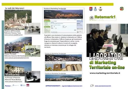 Durata del progetto: Dal 15/03/2009 al 30/03/2011 Giovani dei comuni di: Castelforte (capofila), SS. Cosma e Damiano e Minturno. Esso è stato progettato dopo la consultazione con i cittadini dei tre comuni avvenuta tramite un programma di Bilancio Partecipativo. Il progetto è stato presentato al bando emesso dalla Regione Lazio per "lo sviluppo economico" e ha ottenuto un finanziamento di 300.000,00 €. Il programma realizzativo si è articolato in tre parti: - la scelta e la predisposizione di appositi "laboratori di marketing territoriale" progettati seguendo i principi dell'Ergonomia e realizzati con la collaborazione della SIELazio, - la selezione pubblica e la formazione di 15 giovani per ciascuno dei tre comuni coinvolti sui temi del marketing territoriale, - la gestione dei laboratori da parte dei giovani, una vota formati. Il progetto della predisposizione dei locali ha costituito il progetto di formazione di partecipanti al IV Master per esperti di Ergonomia ed in particolare della dott.ssa Sara Corbo. Esso è poi stato presentato al IX Congresso di Ergonomia tenutosi a Roma il 27 di novembre del 2010 ed è stato pubblicato negli Atti del Congresso. Il progetto della formazione dei giovani e della gestione dei laboratori ha consentito di implementare questo portale di marketing territoriale, sia dal punto di vista tecnologico che per i contenuti in esso contenuti. RETEMARK 1 ha costituito la best practice per la creazione degli altri laboratori di marketing territoriale realizzati nella regione Lazio.
